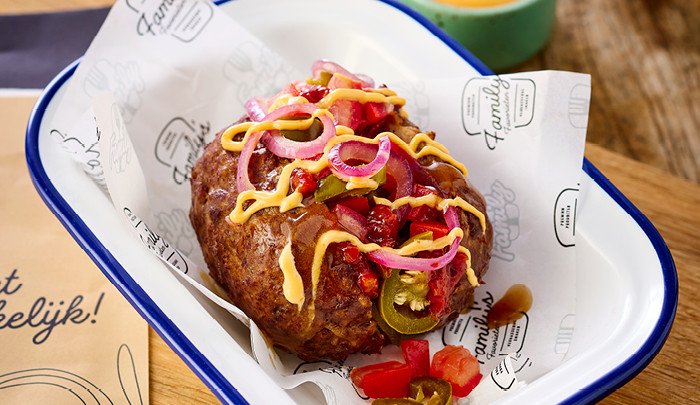 Family Fireball, een loaded meatball gevuld met spicy jalapeño’s, frisse tomaat en gebakken ui. In combinatie met een lekkere salsa en licht pittige sriracha-mayonaise geniet je van elke hap.